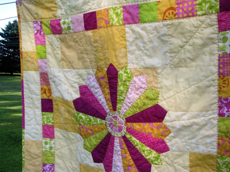 I made this quilt for my daycare provider's new baby girl. I started while she was still pregnant, talked to her best friend to stay in the know on the baby's room colors - yellow, hot pink and lime green, and started pulling from my stash and planning. I based the center dresden plate off Anna Maria Horner's Center of Attention Quilt in Handmade Beginnings.